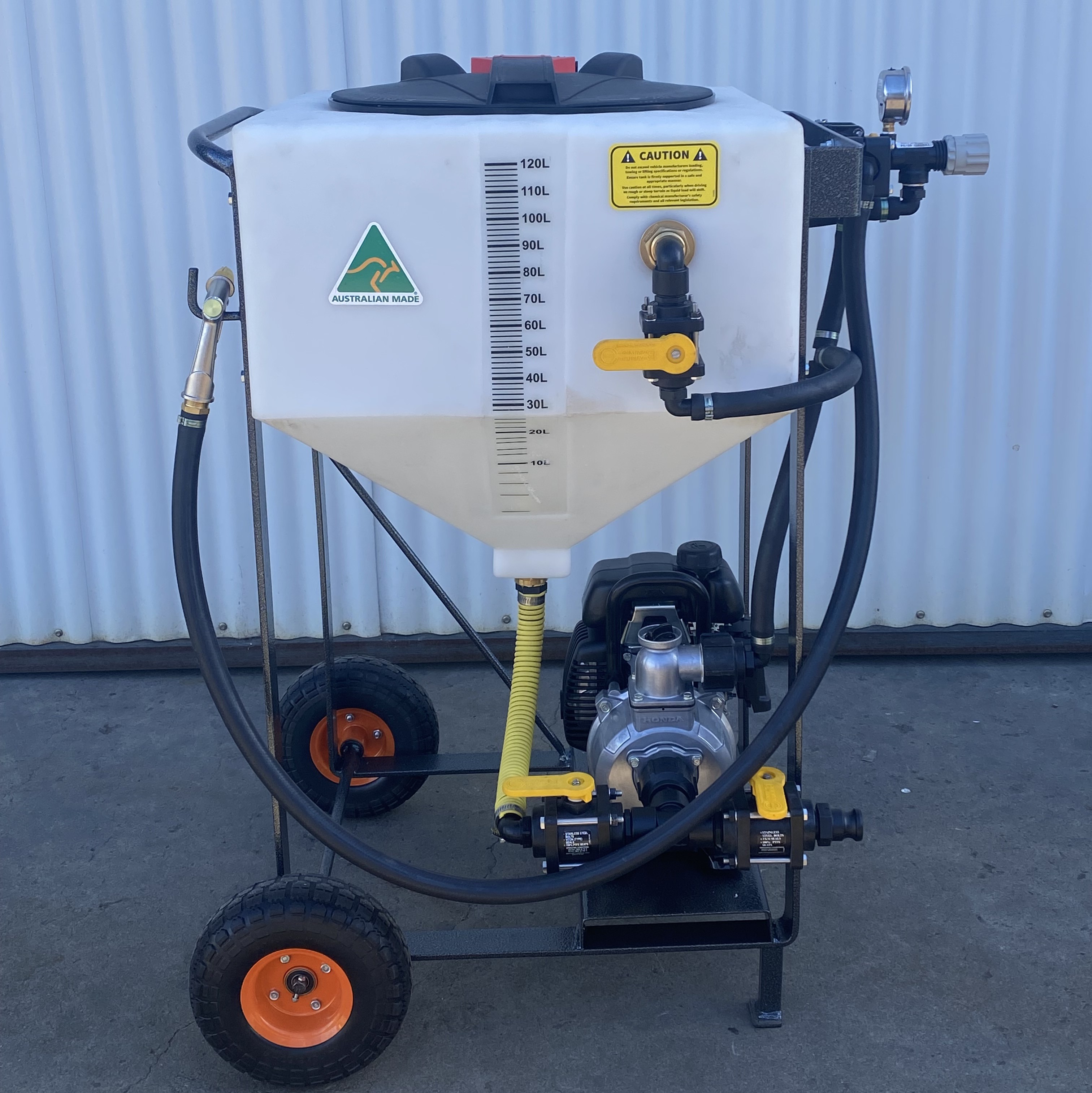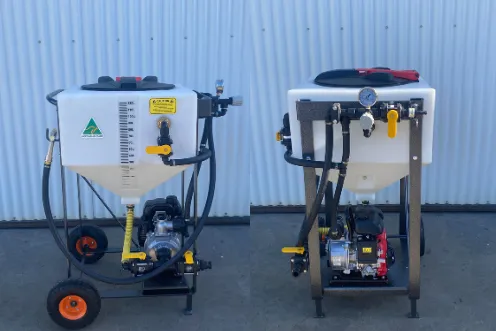 At Ag Spray Centre, we build 120-litre grain treatment picklers. Agitation and delivery are via a Honda WX15 centrifugal pump. Built on a powder-coated frame with puncture-proof wheels and a push/pull handle, the pickler is easy to move around the silo yard. Applying the product is controlled with the pressure relief valve and agitation tap monitored by the pressure gauge, ensuring accurate application. The pump is fitted with a drain/fresh water tap, for ease of cleaning out and changing chemicals. Fitted with a washdown gun to ensure it stays clean.